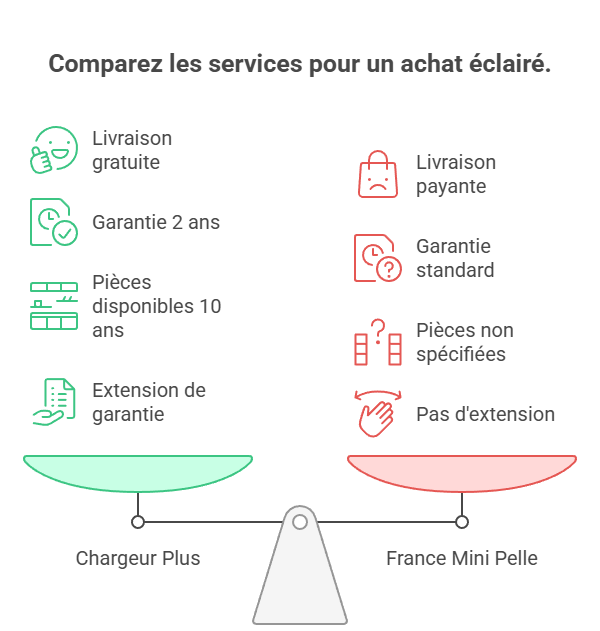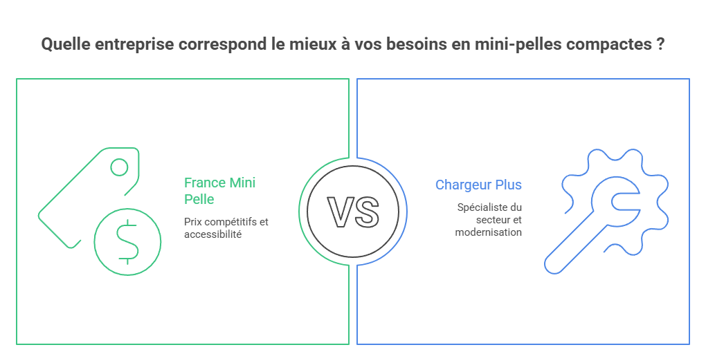 La comparaison entre France Mini Pelle et Chargeur Plus met en évidence deux approches distinctes du marché de la mini-pelle.