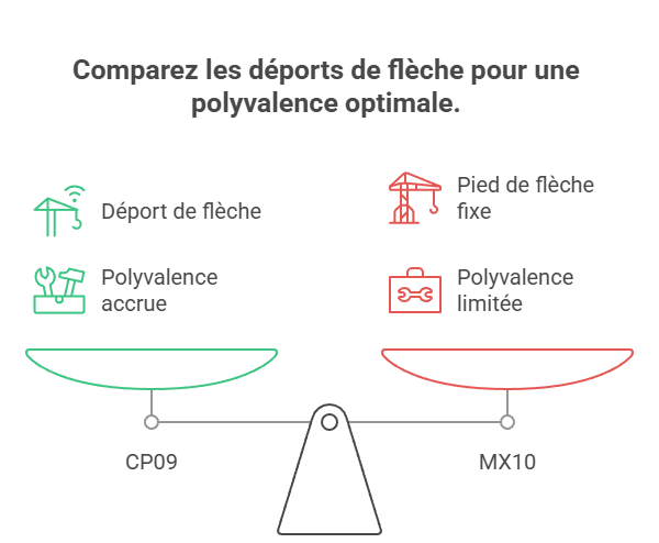 La MX10 se présente comme une solution simple et économique, pour des usages basiques. Toutefois, certaines limitations techniques, comme l’absence de déport de flèche, peuvent restreindre son champ d’application. De plus, la mention “photos non contractuelles” introduit une incertitude sur la configuration réelle de la machine.