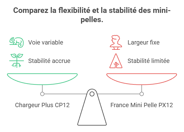 La comparaison entre la PX12 de France Mini Pelle et la CP12 de Chargeur Plus met en évidence deux approches distinctes sur le segment des mini-pelles 1,2 tonne.