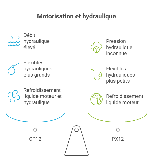 PX12 : refroidissement liquide moteur, mais le type de refroidissement hydraulique est non précisé