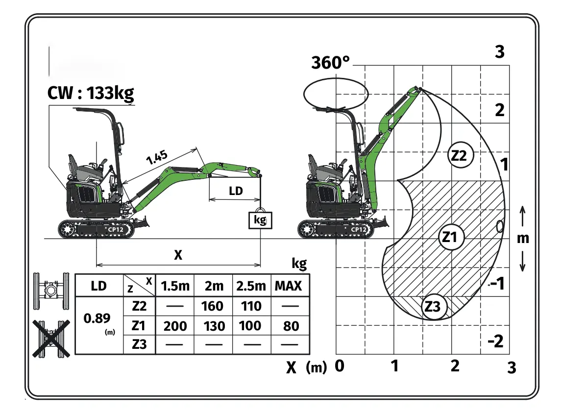 Les dimensions de la CP12 sont idéales pour les travaux dans de nombreux types d’espace. Sa portée maximale est de 3.390 m et sa profondeur de fouille peut atteindre jusqu’à 1.805 m. En ce qui concerne sa hauteur totale de position de travail, elle est de 2.230 m tandis que sa largeur peut s'étendre jusqu’à 99 cm. La longueur des chenilles atteint 1.01m. La longueur de la voie variable, modulable selon les besoins, est entre 75 cm et 99 cm. La flèche permet d’aller jusqu'à 2.225 m. Toutes ces caractéristiques font de la mini-pelle CP12 un engin facilement maniable parfait pour les chantiers.