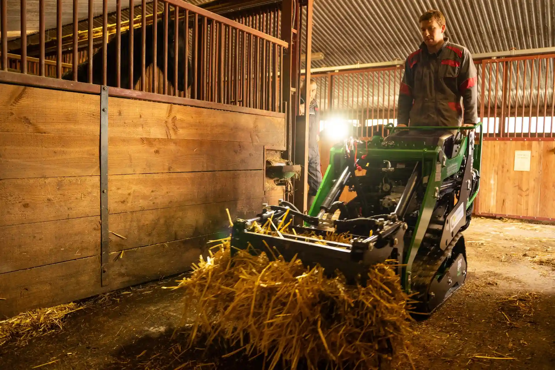 La mini-chargeuse MC306, capable de lever 470 kg à 2 mètres, est idéale pour le curage des boxes, le transport du fumier et la manutention des ballots de foin ou de paille en centre équestre.
